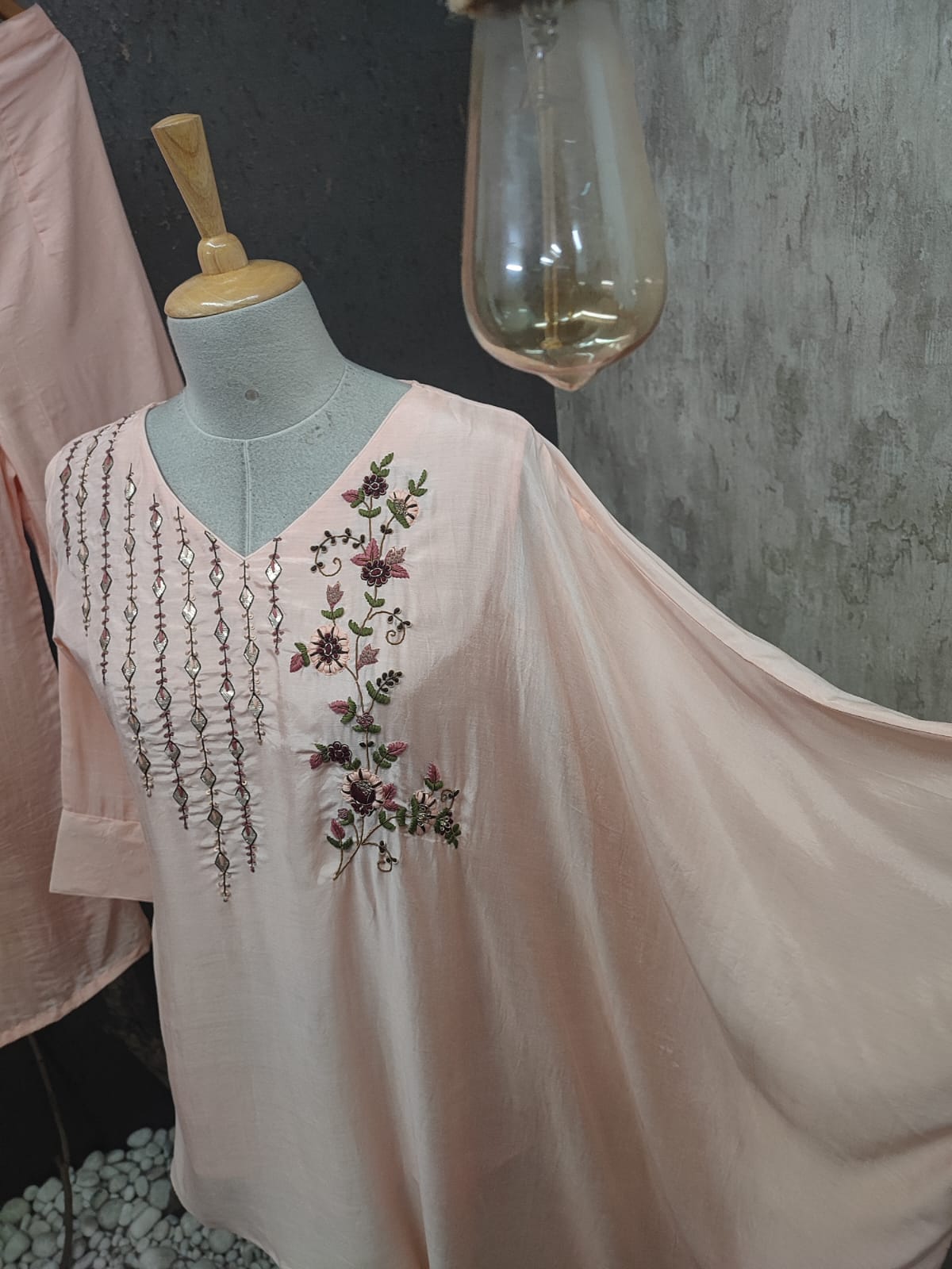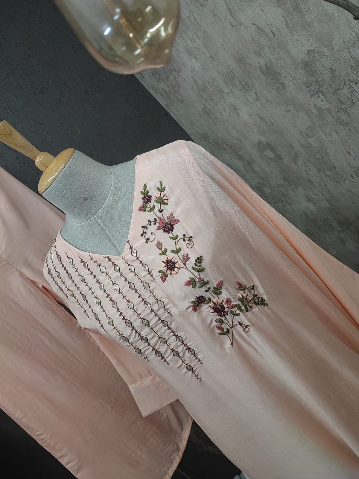 Cotton silk front and back hand embroidered and applique work asymmetric short kurta with one side short and other side long paired with flared palazzo